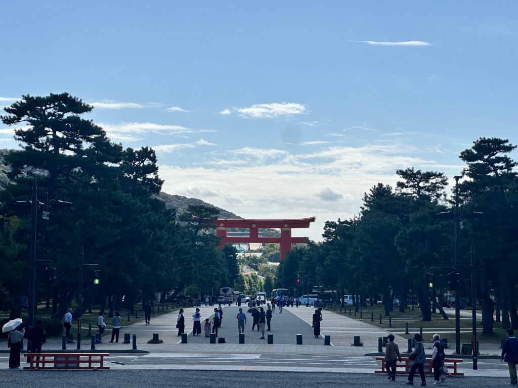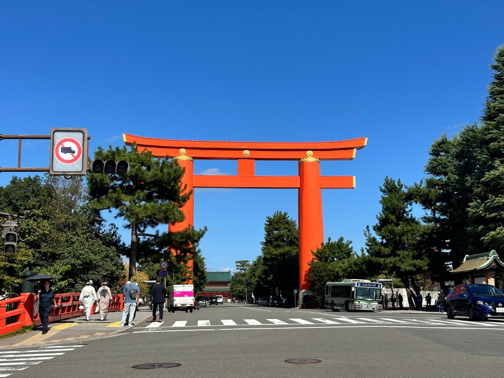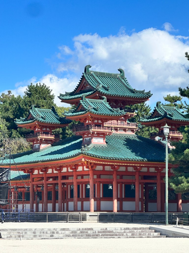 Retour à Kyoto pour visiter l’impressionnant temple Heian—Jingu fondé en 1894 et classé. Le torii (porche d’entrée) est le plus grand du Japon et ses jardins sont sublimes. Toute la fierté des kyotoites se lit dans cette démesure à la gloire des empereurs les plus emblématiques du Japon avant que Tokyo ne devienne la capitale impériale.